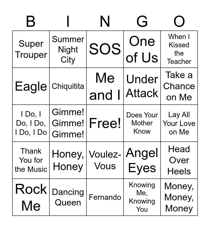 This bingo card has a free space and 30 words: Dancing Queen, Mamma Mia, Gimme! Gimme! Gimme!, Waterloo, Super Trouper, SOS, Chiquitita, Voulez-Vous, Does Your Mother Know, Fernando, Lay All Your Love on Me, Money, Money, Money, Knowing Me, Knowing You, The Winner Takes It All, Take a Chance on Me, I Have a Dream, Angel Eyes, Thank You for the Music, Honey, Honey, When I Kissed the Teacher, I Do, I Do, I Do, I Do, I Do, Ring Ring, Summer Night City, Under Attack, Eagle, One of Us, Head Over Heels, Rock Me, Me and I and Our Last Summer.