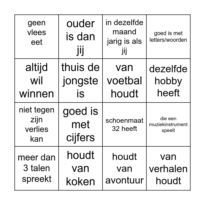 This bingo card has 20 words: meer dan 3 talen spreekt, dezelfde lievelingskleur heeft, in dezelfde maand jarig is als jij, die een muziekinstrument speelt, twee rechterhanden heeft, goed is met cijfers, houdt van avontuur, goed is met letters/woorden, niet tegen zijn verlies kan, ouder is dan jij, schoenmaat 32 heeft, dezelfde hobby heeft, geen vlees eet, houdt van koken, van voetbal houdt, van betekenis is voor anderen in de buurt, altijd wil winnen, thuis de jongste is, thuis de oudste is and van verhalen houdt.