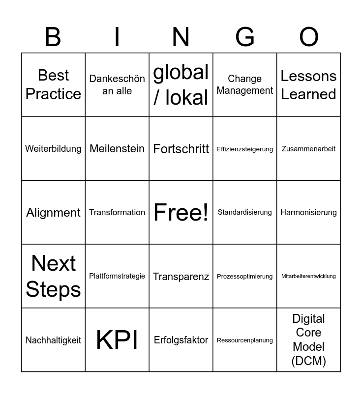 This bingo card has a free space and 40 words: Synergien, Alignment, Roadmap, Meilenstein, KPI, Transparenz, Fortschritt, Herausforderungen, Lessons Learned, Next Steps, Transformation, Change Management, Digital Core Model (DCM), Harmonisierung, Standardisierung, Plattformstrategie, Zukunftsfähigkeit, Best Practice, Rollout, global / lokal, Mitarbeiterentwicklung, Ressourcenplanung, Effizienzsteigerung, Weiterbildung, neue Rollen, Verantwortung, interne Mobilität, Teamspirit, Leadership, Kommunikation, Wichtigkeit, Nachhaltigkeit, Kundenfokus, Prozessoptimierung, Zusammenarbeit, Erfolgsfaktor, Vision, Kulturwandel, Dankeschön an alle and wir sind auf Kurs.