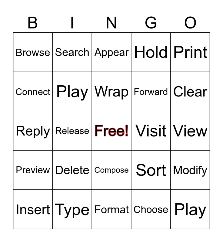 This bingo card has a free space and 24 words: Delete, Type, Wrap, Insert, Print, Browse, Connect, Search, Visit, Compose, Forward, Reply, Sort, Modify, Play, Choose, View, Appear, Clear, Release, Play, Preview, Hold and Format.