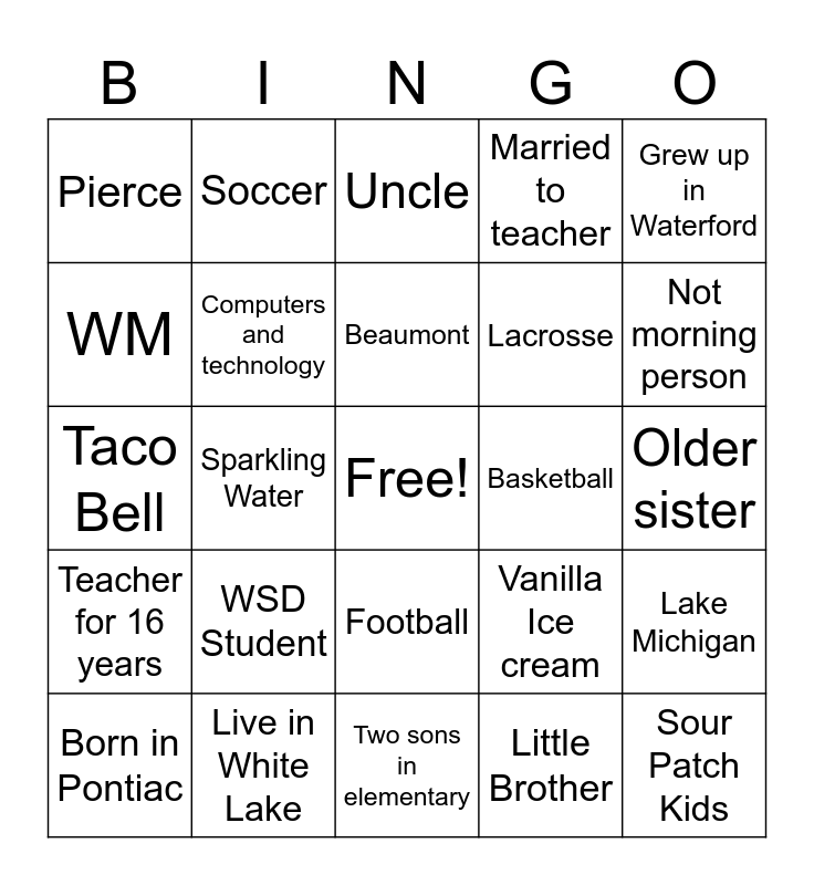 This bingo card has a free space and 24 words: WSD Student, Live in White Lake, Beaumont, Born in Pontiac, Grew up in Waterford, Pierce, WM, Soccer, Basketball, Football, Lacrosse, Taco Bell, Vanilla Ice cream, Lake Michigan, Computers and technology, Little Brother, Older sister, Uncle, Not morning person, Sparkling Water, Sour Patch Kids, Teacher for 16 years, Married to teacher and Two sons in elementary.