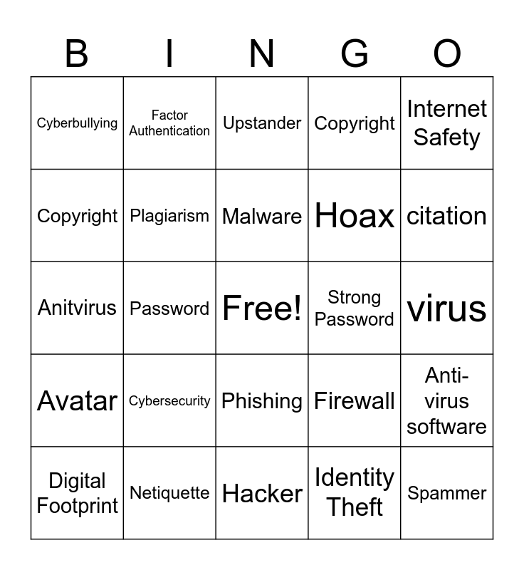 This bingo card has a free space and 24 words: Cybersecurity, Netiquette, Malware, Digital Footprint, Internet Safety, Cyberbullying, Copyright, Factor Authentication, Strong Password, Phishing, Hoax, Anitvirus, Firewall, Anti-virus software, Plagiarism, Identity Theft, virus, Upstander, citation, Password, Spammer, Avatar, Copyright and Hacker.