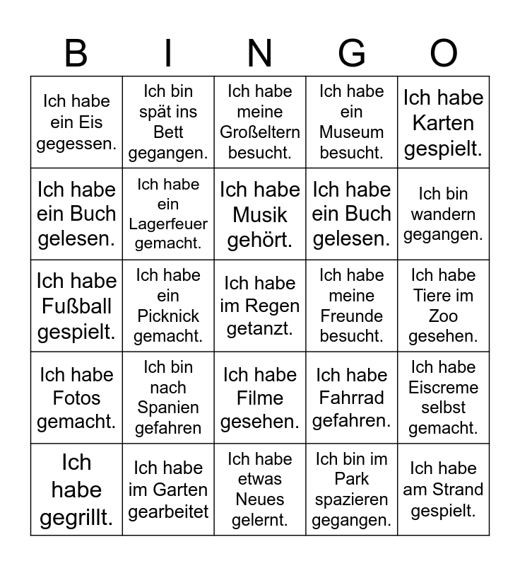This bingo card has a free space and 24 words: Ich bin nach Spanien gefahren, Ich habe im Garten gearbeitet, Ich habe Musik gehört., Ich habe gegrillt., Ich habe Karten gespielt., Ich habe ein Eis gegessen., Ich habe ein Buch gelesen., Ich bin spät ins Bett gegangen., Ich habe meine Freunde besucht., Ich habe Filme gesehen., Ich habe ein Buch gelesen., Ich habe Fußball gespielt., Ich habe Fahrrad gefahren., Ich habe Eiscreme selbst gemacht., Ich habe ein Lagerfeuer gemacht., Ich bin im Park spazieren gegangen., Ich habe Tiere im Zoo gesehen., Ich habe meine Großeltern besucht., Ich bin wandern gegangen., Ich habe ein Picknick gemacht., Ich habe am Strand gespielt., Ich habe Fotos gemacht., Ich habe ein Museum besucht. and Ich habe etwas Neues gelernt..