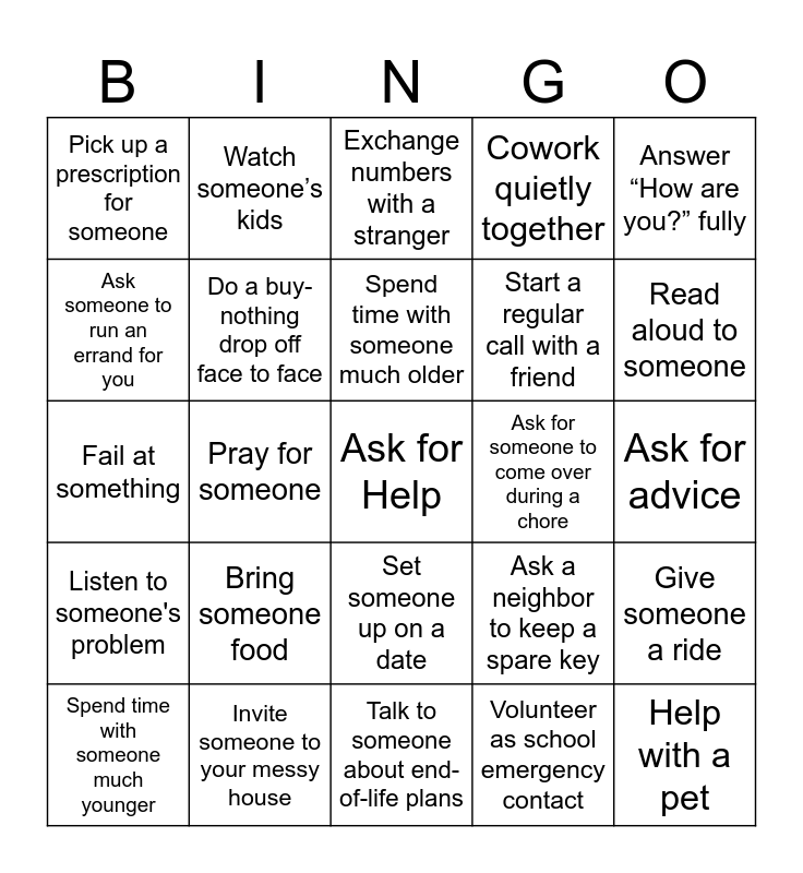 This bingo card has a free space and 24 words: Bring someone food, Invite someone to your messy house, Spend time with someone much older, Spend time with someone much younger, Answer “How are you?” fully, Pick up a prescription for someone, Ask someone to run an errand for you, Watch someone’s kids, Ask for someone to come over during a chore, Set someone up on a date, Start a regular call with a friend, Fail at something, Ask a neighbor to keep a spare key, Give someone a ride, Do a buy-nothing drop off face to face, Volunteer as school emergency contact, Ask for advice, Exchange numbers with a stranger, Read aloud to someone, Pray for someone, Help with a pet, Listen to someone's problem, Cowork quietly together and Talk to someone about end-of-life plans.