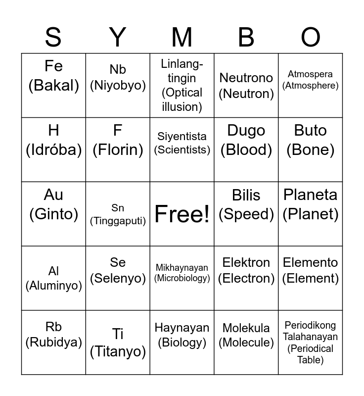 This bingo card has a free space and 24 words: Rb (Rubidya), Se (Selenyo), Siyentista (Scientists), Molekula (Molecule), Atmospera (Atmosphere), Fe (Bakal), Nb (Niyobyo), Linlang-tingin (Optical illusion), Bilis (Speed), Planeta (Planet), Au (Ginto), F (Florin), Elektron (Electron), Elemento (Element), H (Idróba), Ti (Titanyo), Haynayan (Biology), Neutrono (Neutron), Buto (Bone), Al (Aluminyo), Sn (Tinggaputi), Mikhaynayan (Microbiology), Dugo (Blood) and Periodikong Talahanayan (Periodical Table).