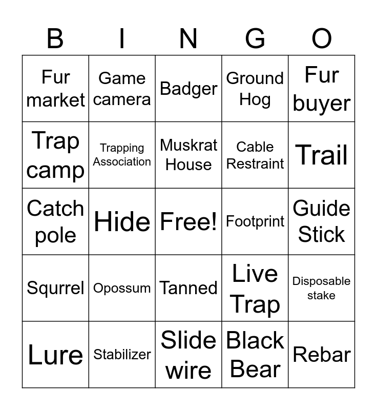 This bingo card has a free space and 91 words: Anchor, Auction house, Badger, Bait, Bank den, Bear Trap, Beaver, Beaver lodge, Black Bear, Blood Trail, Bobcat, Bodygrip, Box Trap, Cable Restraint, Cage Trap, Catch pole, Chipmunk, Coilspring, Coyote, Cubby, Deer, Den Tree, Muskrat House, Dirt Hole, Disposable stake, Dive stick, Dog proof, Drowning Rod, Education, Elk, Fisher, Foothold, Feeder Hut, Footprint, Fur buyer, Fur market, Game camera, Grey Fox, Ground Hog, Guide Stick, Habitat, Hide, Jaw Spread, Live Trap, location, Lure, Lynx, Marsh, Marten, Mink, Muskrat, Opossum, Otter, Pan, Paw, Pelt, Permission, Rabbit, Raccoon, Rebar, Red Fox, Regulations, Scat, Scent, Set, Sifter, Skunk, Slide wire, Snare, Spring, Squrrel, Stabilizer, Tanned, Track, Trail, Trap camp, Trap Dye, Trap Tag, Trap Wax, Trapline, Trapper, Trapping Association, Trapping License, Trigger, Tube trap, Waders, Weasel, Wildlife, Wire, Wolf and Woodchuck.
