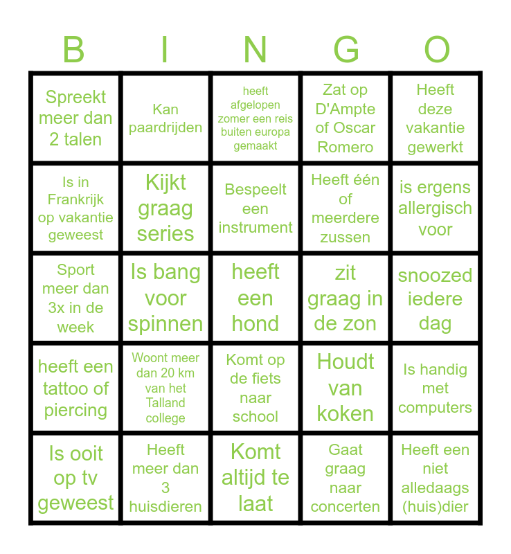 This bingo card has a free space and 24 words: Woont meer dan 20 km van het Talland college, Heeft meer dan 3 huisdieren, Bespeelt een instrument, Is ooit op tv geweest, Heeft deze vakantie gewerkt, Spreekt meer dan 2 talen, Is in Frankrijk op vakantie geweest, Kan paardrijden, zit graag in de zon, Komt op de fiets naar school, Heeft één of meerdere zussen, Sport meer dan 3x in de week, Houdt van koken, Is handig met computers, Kijkt graag series, Gaat graag naar concerten, snoozed iedere dag, heeft afgelopen zomer een reis buiten europa gemaakt, is ergens allergisch voor, Is bang voor spinnen, Heeft een niet alledaags (huis)dier, heeft een tattoo of piercing, Zat op D'Ampte of Oscar Romero and Komt altijd te laat.