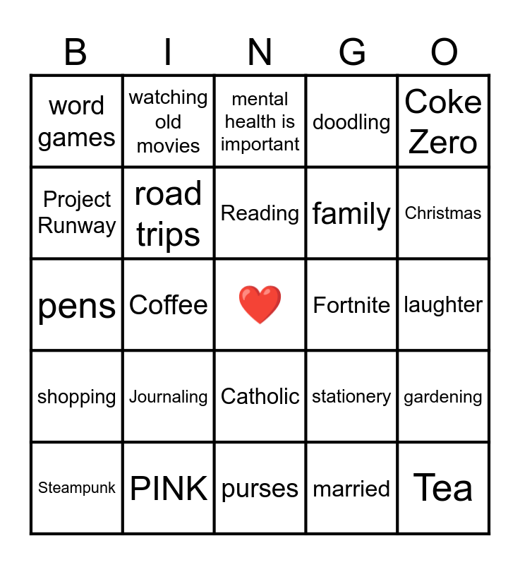 This bingo card has a free space and 24 words: Journaling, PINK, Reading, Steampunk, Coke Zero, word games, Project Runway, watching old movies, Fortnite, Catholic, family, pens, stationery, gardening, road trips, married, laughter, mental health is important, Christmas, Coffee, Tea, shopping, doodling and purses.