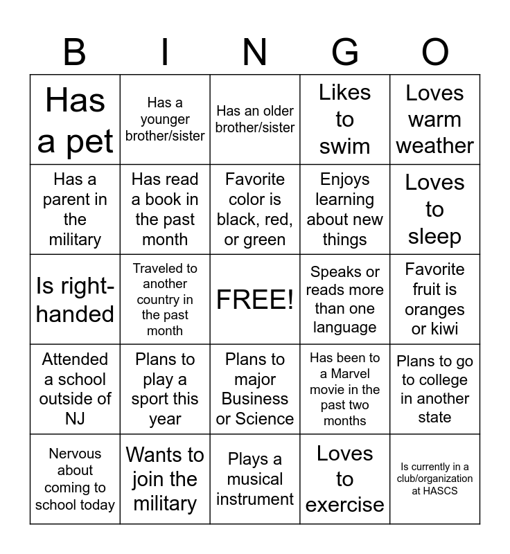 This bingo card has a free space and 24 words: Nervous about coming to school today, Plans to play a sport this year, Favorite color is black, red, or green, Loves to exercise, Loves warm weather, Has a pet, Has a younger brother/sister, Has an older brother/sister, Speaks or reads more than one language, Favorite fruit is oranges or kiwi, Is right-handed, Has read a book in the past month, Has been to a Marvel movie in the past two months, Plans to go to college in another state, Has a parent in the military, Wants to join the military, Plays a musical instrument, Likes to swim, Loves to sleep, Attended a school outside of NJ, Traveled to another country in the past month, Plans to major Business or Science, Enjoys learning about new things and Is currently in a club/organization at HASCS.