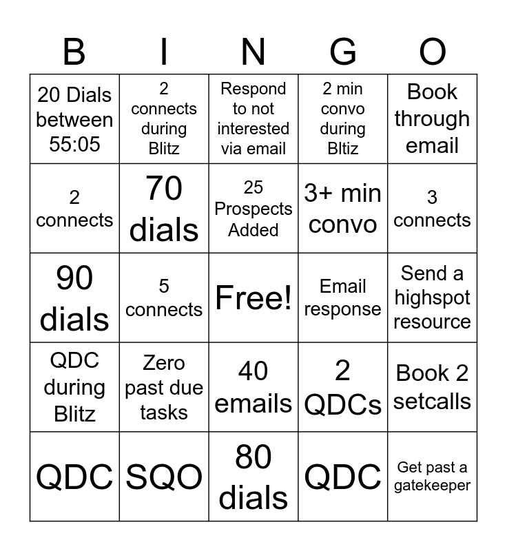 This bingo card has a free space and 24 words: Zero past due tasks, SQO, 25 Prospects Added, QDC, Book through email, 20 Dials between 55:05, 2 connects, 2 connects during Blitz, Email response, 40 emails, 3+ min convo, 90 dials, 2 QDCs, Book 2 setcalls, 70 dials, QDC, Send a highspot resource, Respond to not interested via email, 3 connects, 5 connects, Get past a gatekeeper, QDC during Blitz, 2 min convo during Bltiz and 80 dials.