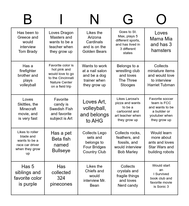 This bingo card has a free space and 24 words: Has a pet Beta fish named Bullseye, Has collected 324 pinecones, Wants to work at a nail salon and be a dog trainer when they grow up, Has 5 siblings and favorite color is purple, Loves Mama Mia and has 3 hamsters, Has been to Greece and would interview Tom Brady, Has a firefighter brother and plays volleyball, Loves Dragon Masters and wants to be a teacher when they grow up, Likes Larosa's pizza and wants to be a cartoonist and art teacher when they grow up, Collects Lego sets and belongs to Four Bridges Country Club, Belongs to a wrestling club and loves The Three Stooges, Loves Skittles, the Minecraft movie, and is very fast, Collects rocks, feathers, and fossils, and would interview Bob Marley, Would learn more about ants and loves Star Wars and building robots, Favorite color is hot pink and would love to go to the Cincinnati Nature Center on a field trip, Collects crystals and fragile things and loves Nerd candy, Favorite soccer team is FCC and wants to be a builder or youtuber when they grow up, Likes the Arizona Cardinals and is on the Golden Bears, Collects miniature items and would love to interview Harriet Tubman, Favorite candy is Swedish Fish and favorite subject is Art, Would start an I Survived book club and favorite movie is Sonic 3, Likes to roller blade and wants to be a race car driver when they grow up, Goes to St. Max, plays 5 different sports, and has lived in 3 different states and Likes the Chiefs and would interview Mr. Bean.