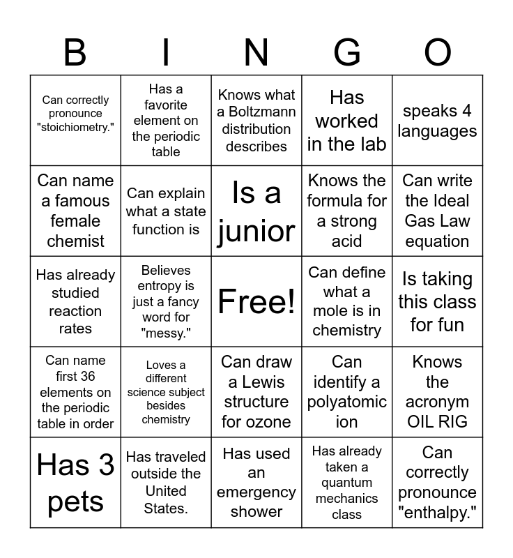 This bingo card has a free space and 24 words: Loves a different science subject besides chemistry, Has traveled outside the United States., Is a junior, Has 3 pets, speaks 4 languages, Can correctly pronounce "stoichiometry.", Can name a famous female chemist, Has a favorite element on the periodic table, Can define what a mole is in chemistry, Can draw a Lewis structure for ozone, Knows the formula for a strong acid, Has already studied reaction rates, Can identify a polyatomic ion, Knows the acronym OIL RIG, Can explain what a state function is, Has already taken a quantum mechanics class, Is taking this class for fun, Knows what a Boltzmann distribution describes, Can write the Ideal Gas Law equation, Believes entropy is just a fancy word for "messy.", Can correctly pronounce "enthalpy.", Can name first 36 elements on the periodic table in order, Has worked in the lab and Has used an emergency shower.