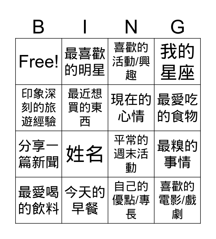 This bingo card has 16 words: 最愛喝 的飲料, 今天的早餐, 喜歡的活動/興趣, 我的 星座, 印象深刻的旅遊經驗, 最喜歡 的明星, 平常的週末活動, 最糗的事情, Free!, 最近想買的東西, 自己的 優點/專長, 最愛吃 的食物, 分享一篇新聞, 姓名, 現在的心情 and 喜歡的電影/戲劇.