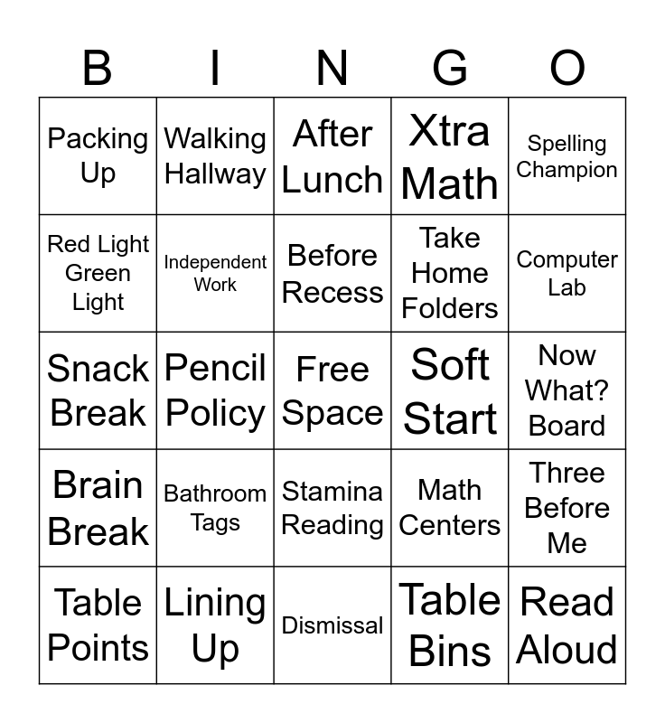 This bingo card has a free space and 24 words: Bathroom Tags, Lining Up, Before Recess, Table Points, Spelling Champion, Packing Up, Red Light Green Light, Walking Hallway, Soft Start, Stamina Reading, Take Home Folders, Snack Break, Math Centers, Three Before Me, Independent Work, Table Bins, Now What? Board, After Lunch, Computer Lab, Pencil Policy, Read Aloud, Brain Break, Xtra Math and Dismissal.