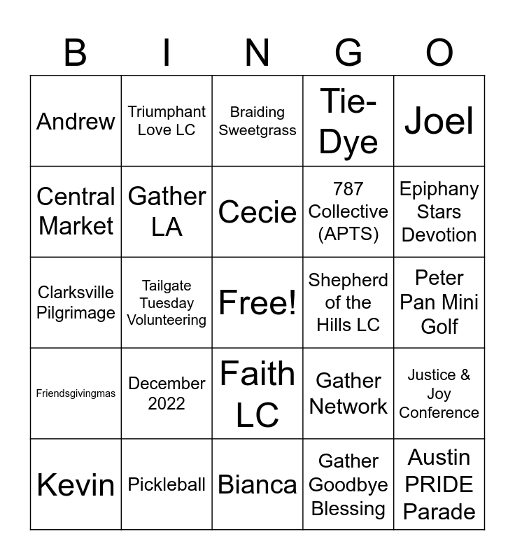 This bingo card has a free space and 25 words: December 2022, Bianca, Cecie, Kevin, Joel, Andrew, Central Market, Triumphant Love LC, Shepherd of the Hills LC, Faith LC, 787 Collective (APTS), Clarksville Pilgrimage, Gather Network, Justice & Joy Conference, Gather LA, Gather Lehigh Valley, Peter Pan Mini Golf, Braiding Sweetgrass, Epiphany Stars Devotion, Tailgate Tuesday Volunteering, Austin PRIDE Parade, Pickleball, Friendsgivingmas, Tie-Dye and Gather Goodbye Blessing.