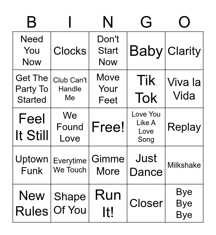 This bingo card has a free space and 50 words: Who Let The Dogs Out, Bye Bye Bye, I Need Your Love, Run It!, Everytime We Touch, Fergalicious, Clocks, Bring Me To Life, Get The Party To Started, I Gotta Feeling, Club Can't Handle Me, Baby, Milkshake, Just Dance, Only Girl In The World, Just The Way You Are, Move Your Feet, Love You Like A Love Song, What Makes You Beautiful, Clarity, We Found Love, Closer, Need You Now, Tik Tok, Heroes (we could be), Airplanes, Viva la Vida, Blank Space, Don't Start Now, Gimme More, Dynamite, Watermelon Sugar, Boom Clap, Crazy In Love, Shape Of You, Pompeii, Super Bass, Break Free, Cake By The Ocean, Replay, Since U Been Gone, Unwritten, Espresso, Sunroof, New Rules, Feel It Still, Thunder, What About Us, Uptown Funk and Uma Thurman.