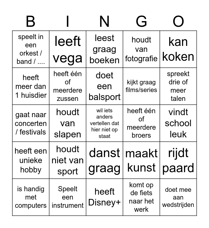 This bingo card has a free space and 24 words: houdt niet van sport, Speelt een instrument, doet een balsport, is handig met computers, kan koken, speelt in een orkest / band / ...., heeft meer dan 1 huisdier, leeft vega, heeft één of meerdere broers, danst graag, kijkt graag films/series, gaat naar concerten / festivals, maakt kunst, rijdt paard, heeft één of meerdere zussen, komt op de fiets naar het werk, vindt school leuk, leest graag boeken, spreekt drie of meer talen, houdt van slapen, doet mee aan wedstrijden, heeft een unieke hobby, houdt van fotografie and heeft Disney+.