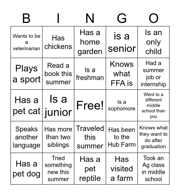 This bingo card has a free space and 24 words: Has more than two siblings, Tried something new this summer, Is a freshman, Has a pet dog, Is an only child, Wants to be a veterinarian, Plays a sport, Has chickens, Is a sophomore, Traveled this summer, Knows what FFA is, Has a pet cat, Has been to the Hub Farm, Knows what they want to do after graduation, Read a book this summer, Has visited a farm, Went to a different middle school than you, Has a home garden, Had a summer job or internship, Is a junior, Took an Ag class in middle school, Speaks another language, is a senior and Has a pet reptile.