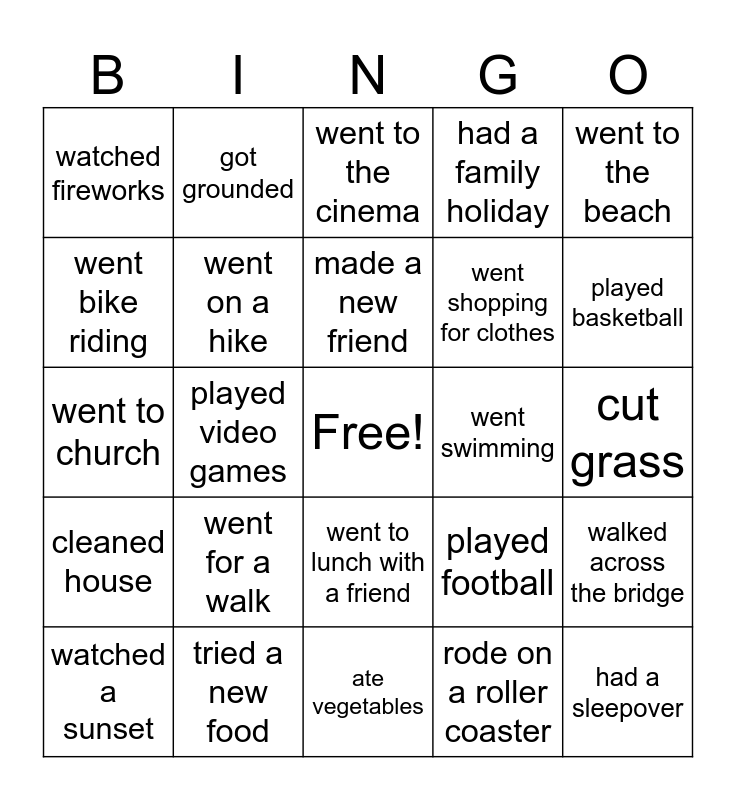 This bingo card has a free space and 24 words: went for a walk, tried a new food, made a new friend, watched a sunset, went to the beach, watched fireworks, went bike riding, got grounded, went swimming, went to lunch with a friend, went shopping for clothes, went to church, played football, walked across the bridge, went on a hike, rode on a roller coaster, cut grass, went to the cinema, played basketball, played video games, had a sleepover, cleaned house, had a family holiday and ate vegetables.