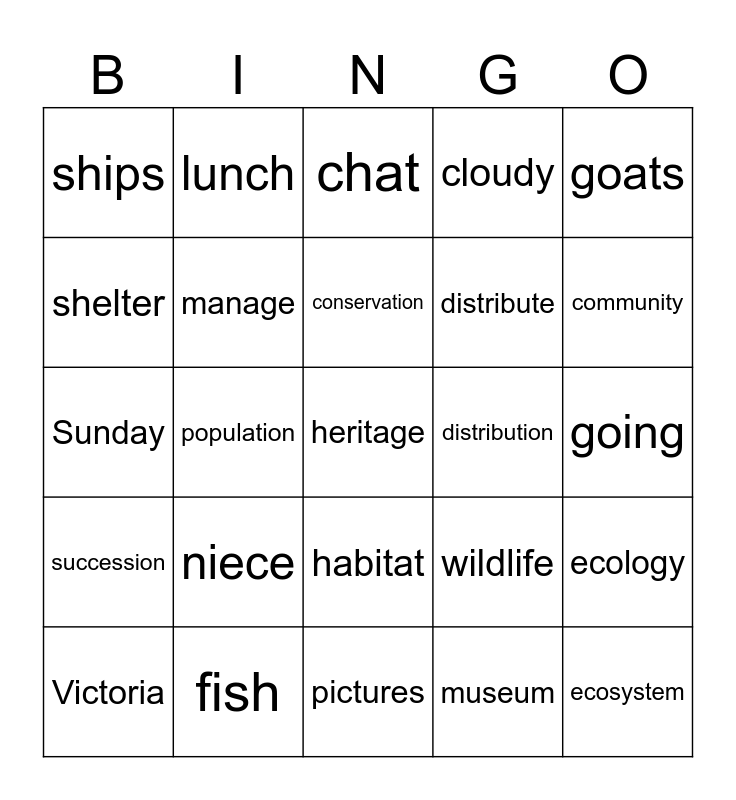 This bingo card has a free space and 24 words: Victoria, niece, conservation, museum, goats, ships, lunch, chat, distribution, going, Sunday, manage, wildlife, ecology, shelter, fish, pictures, cloudy, community, succession, population, habitat, distribute and ecosystem.