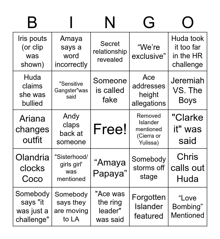 This bingo card has a free space and 29 words: Somebody says "it was just a challenge", Nic stands up for Ace, Andy claps back at someone, Nicolandria makes it official, Iris pouts (or clip was shown), Secret relationship revealed, "Sensitive Gangster"was said, "Sisterhood/ girls girl' was mentioned, Removed Islander mentioned (Cierra or Yulissa), Somebody says they are moving to LA, "Clarke it" was said, “Love Bombing” Mentioned, "Ace was the ring leader" was said, Forgotten Islander featured, Jeremiah VS. The Boys, A couple broke up, “Amaya Papaya”, Olandria clocks Coco, Huda took it too far in the HR challenge, Ariana changes outfit, Somebody storms off stage, Season 6 mentioned, Ace addresses height allegations, Huda claims she was bullied, “We’re exclusive”, Amaya says a word incorrectly, Chris calls out Huda, Someone is called fake and Someone makes a a mamacita joke.