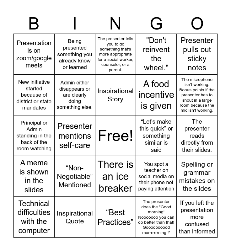 This bingo card has a free space and 24 words: “Non-Negotiable” Mentioned, Inspirational Quote, Inspirational Story, Technical difficulties with the computer, Presenter pulls out sticky notes, Presentation is on zoom/google meets, New initiative started because of district or state mandates, Being presented something you already know or learned, “Let’s make this quick” or something similar is said, There is an ice breaker, A food incentive is given, Principal or Admin standing in the back of the room watching, You spot a teacher on social media on their phone not paying attention, Spelling or grammar mistakes on the slides, Admin either disappears or are clearly doing something else., The presenter does the "Good morning! Nooooooo you can do better than that! Goooooooood morrrrrrrning!!", The presenter reads directly from their slides., The presenter tells you to do something that's more appropriate for a social worker, counselor, or a parent., The microphone isn’t working. Bonus points if the presenter has to shout in a large room because the mic isn’t working., Presenter mentions self-care, If you left the presentation more confused than informed, A meme is shown in the slides, "Don't reinvent the wheel." and “Best Practices”.