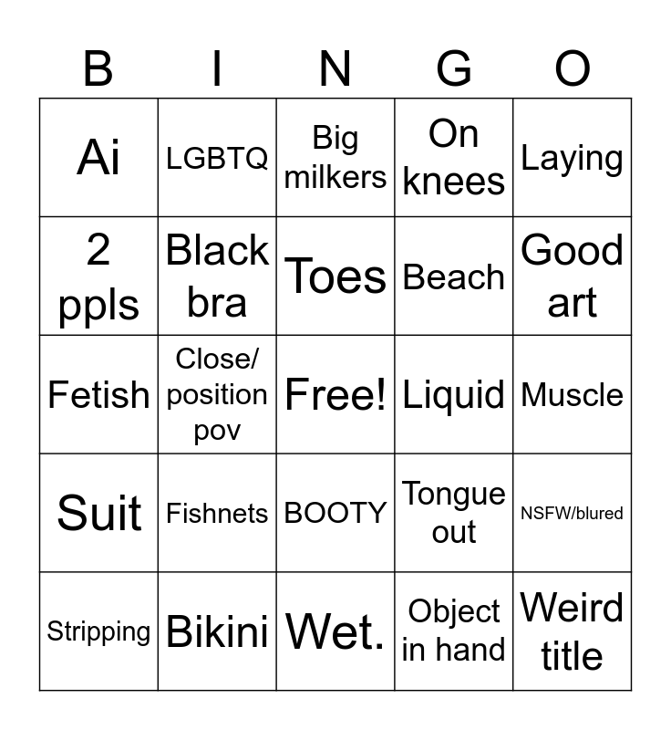 This bingo card has a free space and 24 words: Stripping, Fishnets, Toes, Object in hand, Laying, Ai, LGBTQ, Big milkers, Liquid, Muscle, Fetish, Black bra, Tongue out, NSFW/blured, 2 ppls, Bikini, Wet., On knees, Good art, Suit, Close/ position pov, BOOTY, Beach and Weird title.