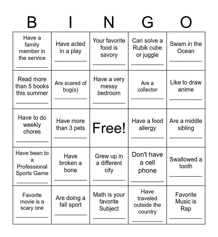 This bingo card has a free space and 24 words: Have broken a bone __________, Are doing a fall sport __________, Have a very messy bedroom __________, Favorite movie is a scary one ___________, Swam in the Ocean __________, Have a family member in the service __________, Read more than 5 books this summer __________, Have acted in a play __________, Have a food allergy __________, Grew up in a different city __________, Are a collector ___________, Have to do weekly chores __________, Don't have a cell phone _________, Swallowed a tooth __________, Are scared of bug(s) ___________, Have traveled outside the country __________, Are a middle sibling __________, Your favorite food is savory __________, Like to draw anime __________, Have more than 3 pets __________, Favorite Music is Rap __________, Have been to a Professional Sports Game __________, Can solve a Rubik cube or juggle __________ and Math is your favorite Subject __________.