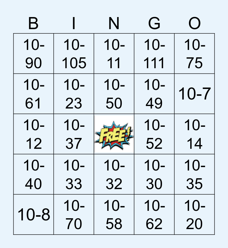 This bingo card has a free space and 29 words: 10-8, 10-31, 10-37, 10-55, 10-90, 10-11, 10-23, 10-33, 10-52, 10-70, 10-14, 10-20, 10-58, 10-62, 10-7, 10-16, 10-32, 10-40, 10-75, 10-12, 10-30, 10-34, 10-49, 10-61, 10-111, 10-105, 10-35, 10-50 and 10-80.