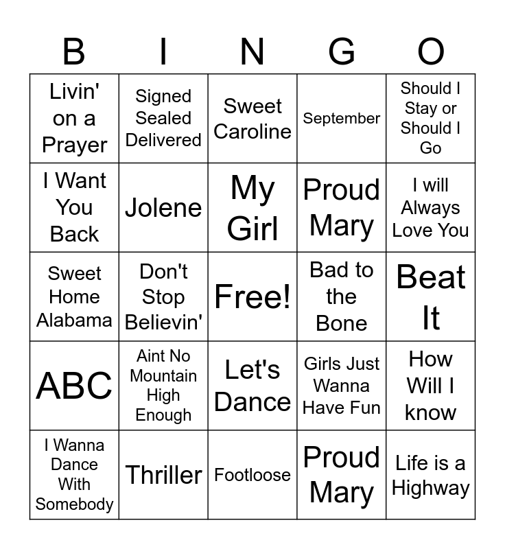 This bingo card has a free space and 24 words: Aint No Mountain High Enough, Thriller, My Girl, I Wanna Dance With Somebody, Should I Stay or Should I Go, Livin' on a Prayer, I Want You Back, Signed Sealed Delivered, Bad to the Bone, Let's Dance, Proud Mary, Sweet Home Alabama, Girls Just Wanna Have Fun, How Will I know, Jolene, Proud Mary, Beat It, Sweet Caroline, I will Always Love You, Don't Stop Believin', Life is a Highway, ABC, September and Footloose.