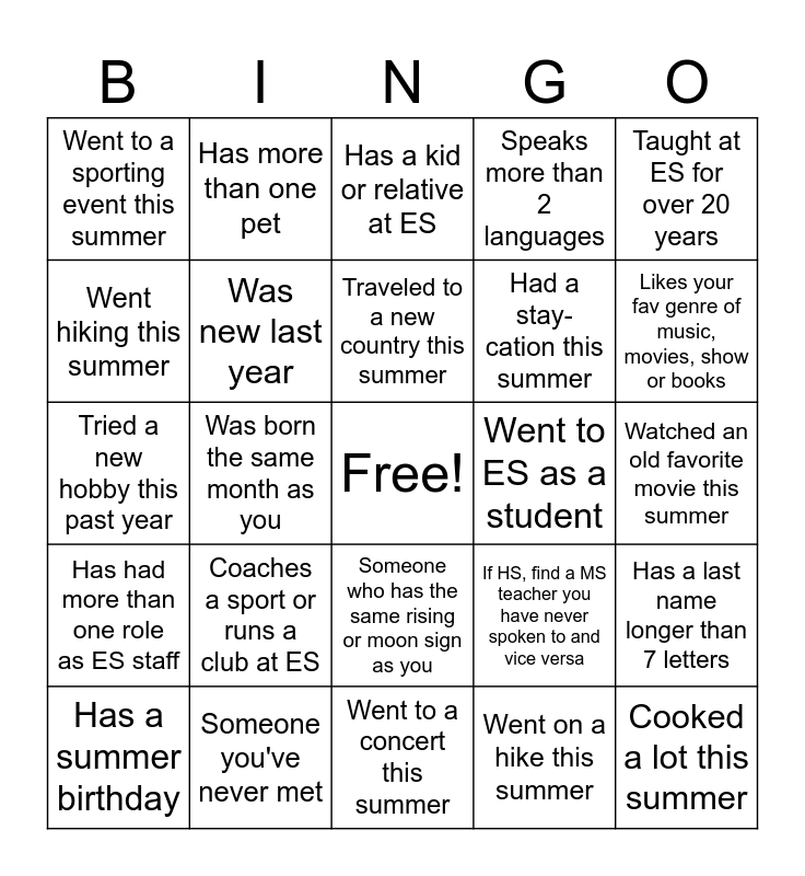 This bingo card has a free space and 29 words: Has a summer birthday, Did something creative this summer, Was born the same month as you, Has a special expertise/skill outside of education, Went to a sporting event this summer, Has a kid or relative at ES, Was new last year, Coaches a sport or runs a club at ES, Went to ES as a student, Someone you've never met, Watched an old favorite movie this summer, Cooked a lot this summer, Went to a concert this summer, Went on a hike this summer, Likes your fav genre of music, movies, show or books, Plays an instument, Someone who has the same rising or moon sign as you, Has had more than one role as ES staff, Taught at ES for over 20 years, Tried a new hobby this past year, If HS, find a MS teacher you have never spoken to and vice versa, Is new to ES this year, Had a stay-cation this summer, Went hiking this summer, Speaks more than 2 languages, Has more than one pet, Has a last name longer than 7 letters, Traveled to a new country this summer and Worked in a different field before education.