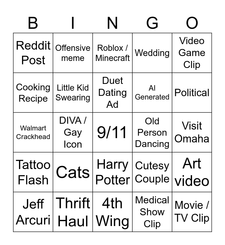 This bingo card has a free space and 24 words: Cats, Thrift Haul, Duet Dating Ad, Jeff Arcuri, Video Game Clip, Reddit Post, Cooking Recipe, Offensive meme, Old Person Dancing, Harry Potter, AI Generated, Walmart Crackhead, Cutesy Couple, Art video, Little Kid Swearing, Medical Show Clip, Visit Omaha, Roblox / Minecraft, Political, DIVA / Gay Icon, Movie / TV Clip, Tattoo Flash, Wedding and 4th Wing.