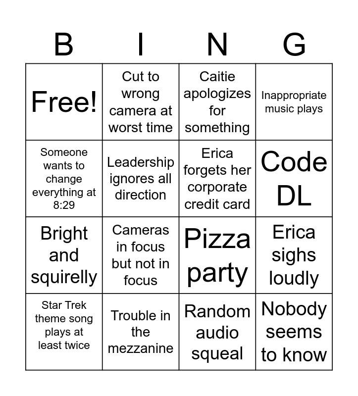 This bingo card has 19 words: Star Trek theme song plays at least twice, Jenna smiles through the pain, Caitie apologizes for something, Erica sighs loudly, Someone doesn't submit their lunch order in a timely fashion, Cut to wrong camera at worst time, Random audio squeal, Inappropriate music plays, Free!, Cameras in focus but not in focus, Erica forgets her corporate credit card, Code DL, Bright and squirelly, Trouble in the mezzanine, Pizza party, Nobody seems to know, Someone wants to change everything at 8:29, Leadership ignores all direction and Missed first 3 sentences of speaker.