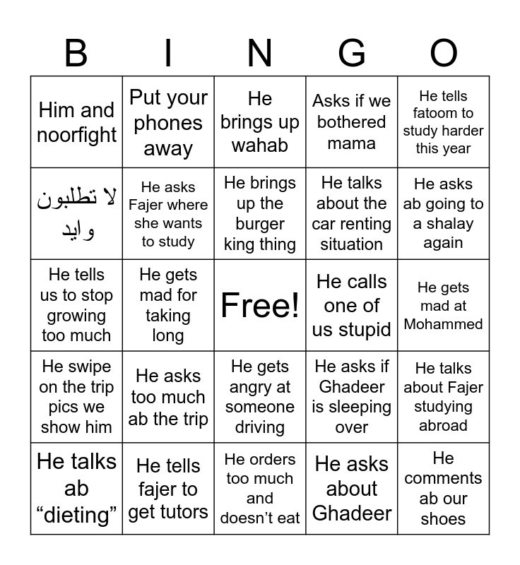 This bingo card has a free space and 24 words: He asks too much ab the trip, He tells fajer to get tutors, He brings up the burger king thing, He talks ab “dieting”, He tells fatoom to study harder this year, Him and noorfight, لا تطلبون وايد, Put your phones away, He calls one of us stupid, He gets angry at someone driving, He talks about the car renting situation, He tells us to stop growing too much, He asks if Ghadeer is sleeping over, He talks about Fajer studying abroad, He asks Fajer where she wants to study, He asks about Ghadeer, He gets mad at Mohammed, He brings up wahab, He asks ab going to a shalay again, He gets mad for taking long, He comments ab our shoes, He swipe on the trip pics we show him, Asks if we bothered mama and He orders too much and doesn’t eat.