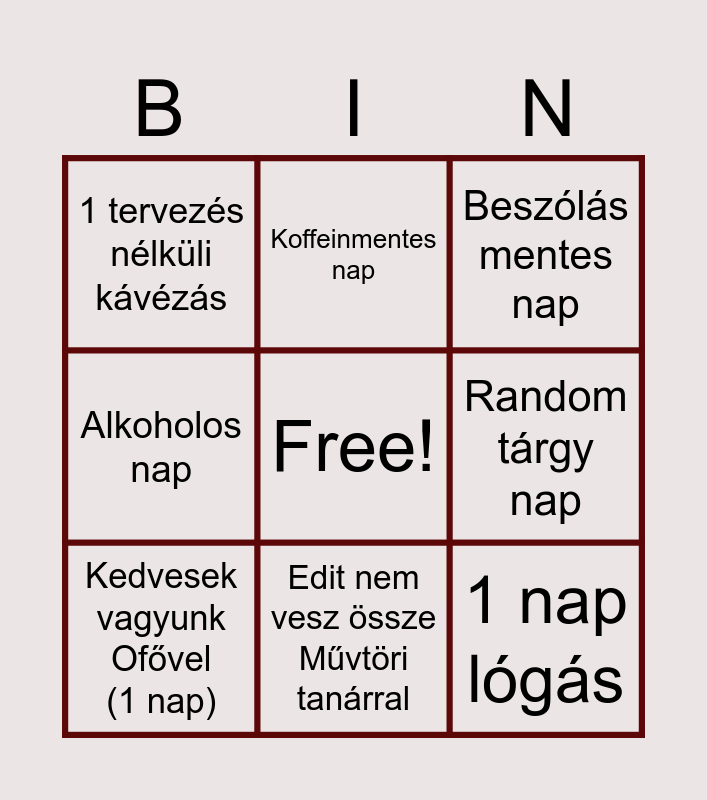 This bingo card has a free space and 8 words: Random tárgy nap, Beszólás mentes nap, Koffeinmentes nap, Kedvesek vagyunk Ofővel (1 nap), 1 tervezés nélküli kávézás, 1 nap lógás, Alkoholos nap and Edit nem vesz össze Művtöri tanárral.