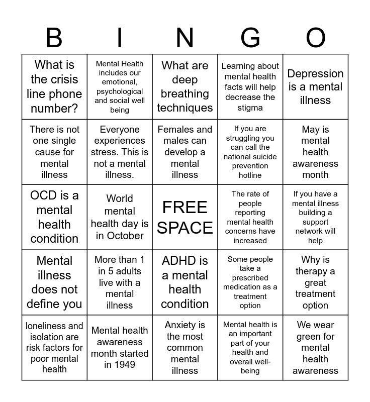This bingo card has a free space and 25 words: More than 1 in 5 adults live with a mental illness, Anxiety is the most common mental illness, Females and males can develop a mental illness, loneliness and isolation are risk factors for poor mental health, Depression is a mental illness, What is the crisis line phone number?, There is not one single cause for mental illness, Mental Health includes our emotional, psychological and social well being, The rate of people reporting mental health concerns have increased, ADHD is a mental health condition, If you are struggling you can call the national suicide prevention hotline, OCD is a mental health condition, Some people take a prescribed medication as a treatment option, Why is therapy a great treatment option, Everyone experiences stress. This is not a mental illness., Chronic health conditions, such as cancer or diabetes contribute to mental illness, If you have a mental illness building a support network will help, What are deep breathing techniques, May is mental health awareness month, World mental health day is in October, We wear green for mental health awareness, Mental health awareness month started in 1949, Mental illness does not define you, Learning about mental health facts will help decrease the stigma and Mental health is an important part of your health and overall well-being.