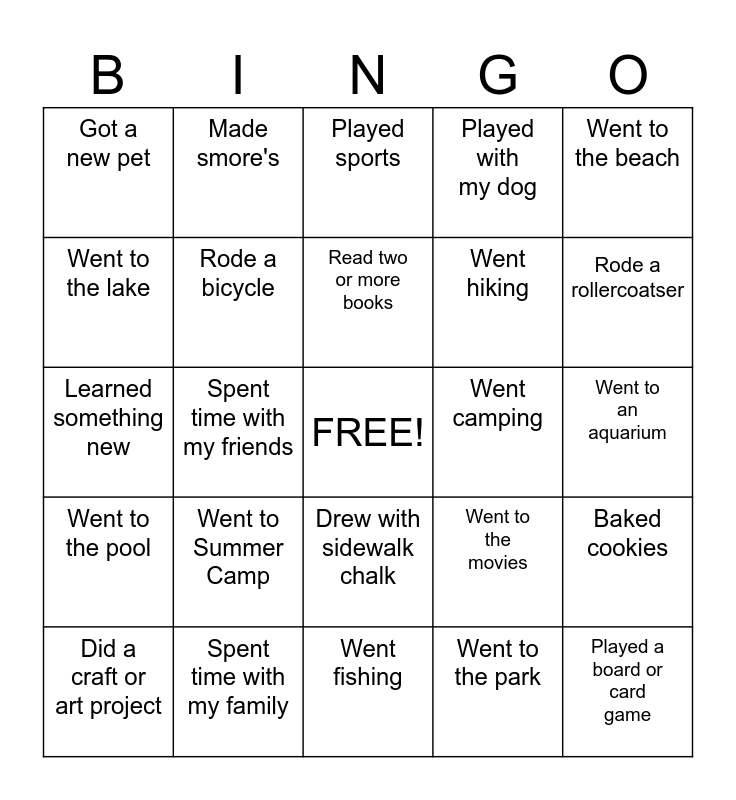 This bingo card has a free space and 24 words: Went to Summer Camp, Spent time with my family, Read two or more books, Did a craft or art project, Went to the beach, Got a new pet, Went to the lake, Made smore's, Went camping, Drew with sidewalk chalk, Went hiking, Learned something new, Went to the movies, Baked cookies, Rode a bicycle, Went to the park, Went to an aquarium, Played sports, Rode a rollercoatser, Spent time with my friends, Played a board or card game, Went to the pool, Played with my dog and Went fishing.