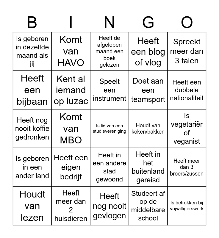 This bingo card has a free space and 26 words: Heeft in een andere stad gewoond, Studeert af op de middelbare school, Speelt een instrument, Heeft meer dan 2 huisdieren, Spreekt meer dan 3 talen, Is geboren in dezelfde maand als jij, Heeft een bijbaan, Komt van HAVO, Is vegetariër of veganist, Heeft in het buitenland gereisd, Doet aan een teamsport, Heeft nog nooit koffie gedronken, Heeft meer dan 3 broers/zussen, Houdt van lezen, Komt van MBO, Heeft een tatoeage, Heeft een blog of vlog, Is geboren in een ander land, Heeft de afgelopen maand een boek gelezen, Is betrokken bij vrijwilligerswerk, Heeft een dubbele nationaliteit, Heeft nog nooit gevlogen, Houdt van koken/bakken, Heeft een eigen bedrijf, Kent al iemand op luzac and Heeft vorig jaar ook op Luzac gezeteb.