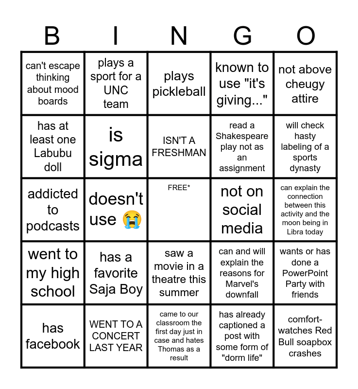 This bingo card has a free space and 24 words: has a favorite Saja Boy, WENT TO A CONCERT LAST YEAR, ISN'T A FRESHMAN, has facebook, not above cheugy attire, can't escape thinking about mood boards, has at least one Labubu doll, plays a sport for a UNC team, not on social media, saw a movie in a theatre this summer, read a Shakespeare play not as an assignment, addicted to podcasts, can and will explain the reasons for Marvel's downfall, wants or has done a PowerPoint Party with friends, is sigma, has already captioned a post with some form of "dorm life", can explain the connection between this activity and the moon being in Libra today, plays pickleball, will check hasty labeling of a sports dynasty, doesn't use 😭, comfort-watches Red Bull soapbox crashes, went to my high school, known to use "it's giving..." and came to our classroom the first day just in case and hates Thomas as a result.