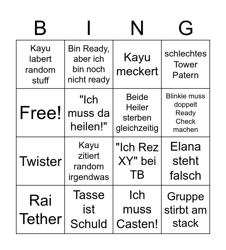 This bingo card has 16 words: Tasse ist Schuld, Elana steht falsch, Kayu meckert, Kayu labert random stuff, Twister, Bin Ready, aber ich bin noch nicht ready, "Ich Rez XY" bei TB, Ich muss Casten!, Free!, "Ich muss da heilen!", Rai Tether, schlechtes Tower Patern, Kayu zitiert random irgendwas, Blinkie muss doppelt Ready Check machen, Beide Heiler sterben gleichzeitig and Gruppe stirbt am stack.