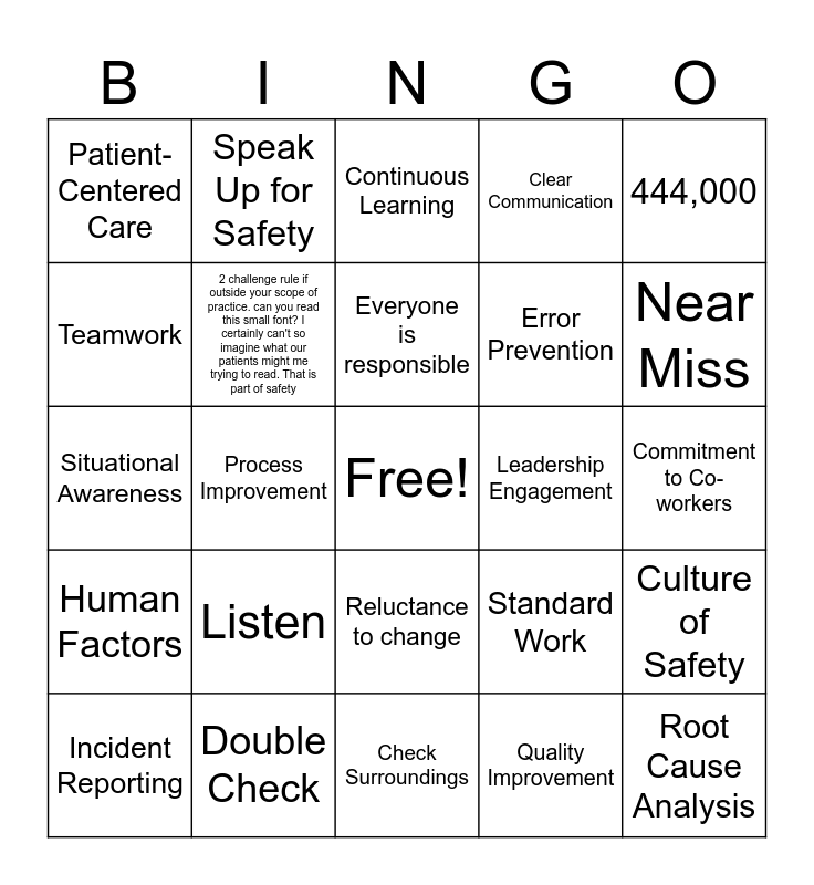 This bingo card has a free space and 24 words: Listen, Double Check, Everyone is responsible, Incident Reporting, 444,000, Patient-Centered Care, Teamwork, Speak Up for Safety, Leadership Engagement, Reluctance to change, Error Prevention, Situational Awareness, Standard Work, Culture of Safety, 2 challenge rule if outside your scope of practice. can you read this small font? I certainly can't so imagine what our patients might me trying to read. That is part of safety, Quality Improvement, Commitment to Co-workers, Continuous Learning, Near Miss, Process Improvement, Root Cause Analysis, Human Factors, Clear Communication and Check Surroundings.