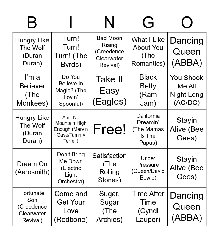 ⚠ This card has duplicate items: Jessie’s Girl (Rick Springfield) (2), Don’t Stop Believin’ (Journey) (2), Africa (TOTO) (2), Under Pressure (Queen/David Bowie) (2), Girls Just Want To Have Fun (Cyndi Lauper) (2), Danger Zone (Kenny Loggins) (2), Billie Jean (Michael Jackson) (2), Wake Me Up Before You Go-Go (Wham!) (2), Sweet Child O’Mine (Guns N’ Roses) (2), You Shook Me All Night Long (AC/DC) (2), Uptown Girl (Billy Joel) (2), Another One Bites The Dust (Queen) (2), Time After Time (Cyndi Lauper) (2), Down Under (Men At Work) (2), Hungry Like The Wolf (Duran Duran) (2), Take on Me (a-ha) (2), Eye of the Tiger (Survivor) (2), We Built This City (Starship) (2), The Power of Love (Huey Lewis & The News) (2), We Didn’t Start the Fire (Billy Joel) (2), Walking On Sunshine (Katrina & The Waves) (2), Karma Chameleon (Culture Club) (2), I’m Gonna Be (The Proclaimers) (2), Got My Mind Set on You (George Harrison) (2), September (Earth, Wind & Fire) (2), Come and Get Your Love (Redbone) (2), More Than a Feeling (Boston) (2), Rasputin (Boney M.) (2), Lean on Me (Bill Withers) (2), Boogie Wonderland (Earth, Wind & Fire/The Emotions) (2), Don’t Bring Me Down (Electric Light Orchestra) (2), Brown Eyed Girl (Van Morrison) (2), T.N.T. (AC/DC) (2), Ain’t No Stoppin’ Us Now (McFadden & Whitehead) (2), Dream On (Aerosmith) (2), Don’t Look Back (Boston) (2), Just the Way You Are (Billy Joel) (2), Two Tickets to Paradise (Eddie Money) (2), Dancing Queen (ABBA) (2), Go Your Own Way (Fleetwood Mac) (2), La Grange (ZZ Top) (2), Mamma Mia (ABBA) (2), Black Betty (Ram Jam) (2), Rocket Man (Elton John) (2), Sweet Emotion (Aerosmith) (2), Love Train (The O’Jays) (2), Take It Easy (Eagles) (2), What I Like About You (The Romantics) (2), Stayin Alive (Bee Gees) (2), Oh, Pretty Woman (Roy Orbison) (2), Ain’t No Mountain High Enough (Marvin Gaye/Tammy Terrell) (2), Black Magic Woman (Santana) (2), Happy Together (The Turtles) (2), Ring of Fire (Johnny Cash) (2), Fortunate Son (Creedence Clearwater Revival) (2), Respect (Aretha Franklin) (2), Sugar, Sugar (The Archies) (2), Paint It, Black (The Rolling Stones) (2), Kodachrome (Paul Simon) (2), Stand By Me (Ben E. King) (2), My Girl (The Temptations) (2), Satisfaction (The Rolling Stones) (2), California Dreamin’ (The Mamas & The Papas) (2), You Really Got Me (The Kinks) (2), Shout (The Isley Brothers) (2), Turn! Turn! Turn! (The Byrds) (2), Bad Moon Rising (Creedence Clearwater Revival) (2), These Boots Are Made For Walkin’ (Nancy Sinatra) (2), Born To Be Wild (Steppenwolf) (2), I’m a Believer (The Monkees) (2), Do You Believe In Magic? (The Lovin’ Spoonful) (2), Jump in the Line (Harry Belafonte) (2), Dance to the Music (Sly & The Family Stone) (2), Mr. Sandman (The Chordettes) (2), You Can’t Hurry Love (The Supremes) (2)
