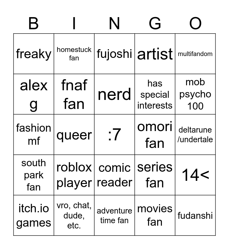 This bingo card has a free space and 24 words: roblox player, vro, chat, dude, etc., nerd, itch.io games, multifandom, freaky, alex g, homestuck fan, omori fan, comic reader, has special interests, fashion mf, series fan, 14<, fnaf fan, movies fan, deltarune /undertale, fujoshi, mob psycho 100, queer, fudanshi, south park fan, artist and adventure time fan.