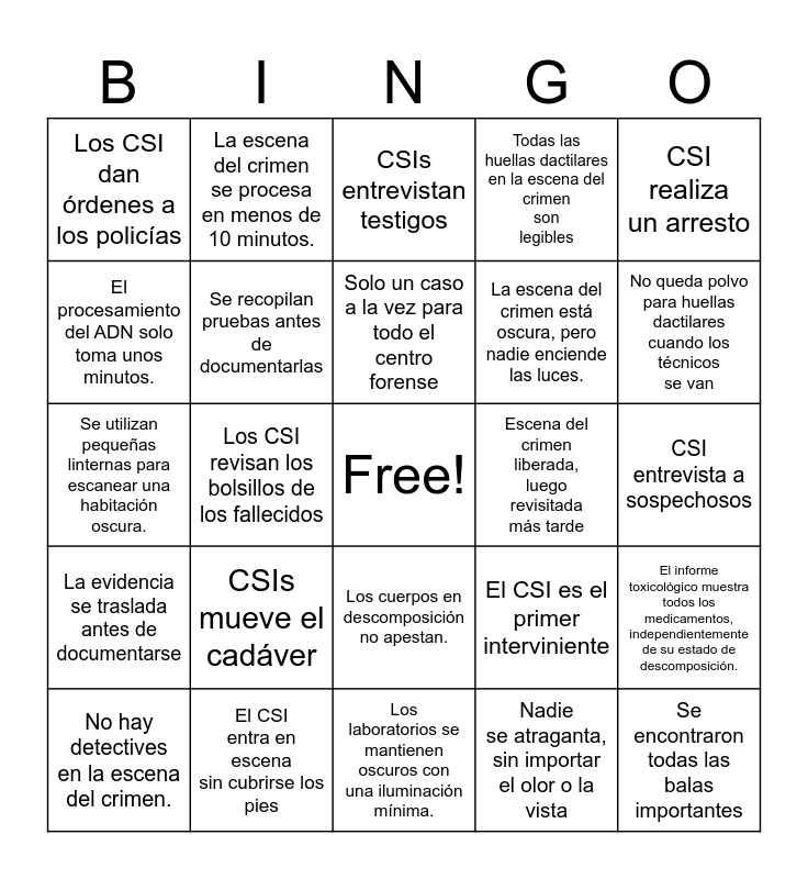 This bingo card has a free space and 24 words: CSIs mueve el cadáver, El CSI entra en escena sin cubrirse los pies, Solo un caso a la vez para todo el centro forense, No hay detectives en la escena del crimen., CSI realiza un arresto, Los CSI dan órdenes a los policías, El procesamiento del ADN solo toma unos minutos., La escena del crimen se procesa en menos de 10 minutos., Escena del crimen liberada, luego revisitada más tarde, Los cuerpos en descomposición no apestan., La escena del crimen está oscura, pero nadie enciende las luces., Se utilizan pequeñas linternas para escanear una habitación oscura., El CSI es el primer interviniente, El informe toxicológico muestra todos los medicamentos, independientemente de su estado de descomposición., Se recopilan pruebas antes de documentarlas, Nadie se atraganta, sin importar el olor o la vista, CSI entrevista a sospechosos, CSIs entrevistan testigos, No queda polvo para huellas dactilares cuando los técnicos se van, Los CSI revisan los bolsillos de los fallecidos, Se encontraron todas las balas importantes, La evidencia se traslada antes de documentarse, Todas las huellas dactilares en la escena del crimen son legibles and Los laboratorios se mantienen oscuros con una iluminación mínima..