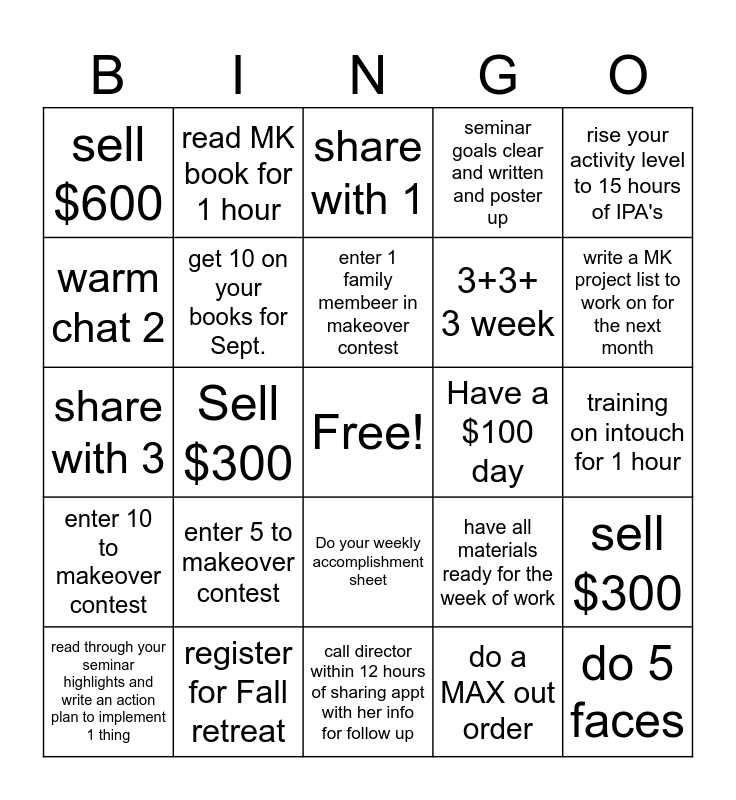 This bingo card has a free space and 24 words: enter 5 to makeover contest, register for Fall retreat, enter 1 family membeer in makeover contest, read through your seminar highlights and write an action plan to implement 1 thing, rise your activity level to 15 hours of IPA's, sell $600, warm chat 2, read MK book for 1 hour, Have a $100 day, Do your weekly accomplishment sheet, 3+3+ 3 week, share with 3, have all materials ready for the week of work, sell $300, get 10 on your books for Sept., do a MAX out order, training on intouch for 1 hour, share with 1, write a MK project list to work on for the next month, Sell $300, do 5 faces, enter 10 to makeover contest, seminar goals clear and written and poster up and call director within 12 hours of sharing appt with her info for follow up.