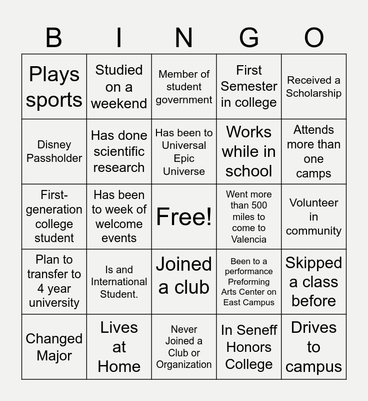 This bingo card has a free space and 24 words: Changed Major, Is and International Student., Has been to Universal Epic Universe, In Seneff Honors College, Received a Scholarship, Plays sports, Studied on a weekend, Member of student government, Went more than 500 miles to come to Valencia, Volunteer in community, First-generation college student, Has done scientific research, Been to a performance Preforming Arts Center on East Campus, Skipped a class before, Disney Passholder, Lives at Home, Never Joined a Club or Organization, First Semester in college, Attends more than one camps, Plan to transfer to 4 year university, Has been to week of welcome events, Joined a club, Works while in school and Drives to campus.