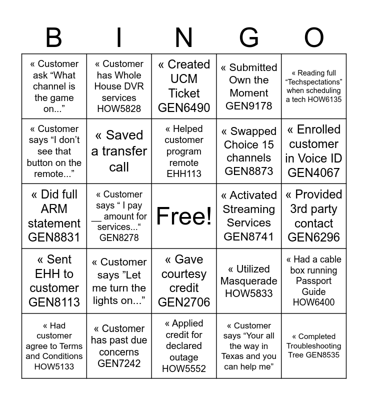This bingo card has a free space and 32 words: « Customer says “Your all the way in Texas and you can help me”, « Activated Pods HOW5466, « Customer says “ I pay __ amount for services...“ GEN8278, « Fixed no signal issue by customer powering on box EHH284, « Sent EHH to customer GEN8113, « Saved a transfer call, « Reading full “Techspectations” when scheduling a tech HOW6135, « Had a cable box running Passport Guide HOW6400, « Customer has Whole House DVR services HOW5828, « Customer had Guide Filters enabled HOW6400, « Helped customer program remote EHH113, « Created UCM Ticket GEN6490, « Promoted Self-Service options GEN8291, « Customer says “I’m to old...”, « Activated Streaming Services GEN8741, « Setup Xumo box HOW7310, « Had customer agree to Terms and Conditions HOW5133, « Did full ARM statement GEN8831, « Gave courtesy credit GEN2706, « Customer says ”Let me turn the lights on...”, « Utilized Masquerade HOW5833, « Completed Ascendon order HOW7595, « Provided 3rd party contact GEN6296, « Customer has past due concerns GEN7242, « Completed Troubleshooting Tree GEN8535, « Submitted Own the Moment GEN9178, « Swapped Choice 15 channels GEN8873, « Customer says “I don’t see that button on the remote...”, « Customer ask “What channel is the game on...”, « Applied credit for declared outage HOW5552, « Created Spectrum.net login HOW6734 and « Enrolled customer in Voice ID GEN4067.