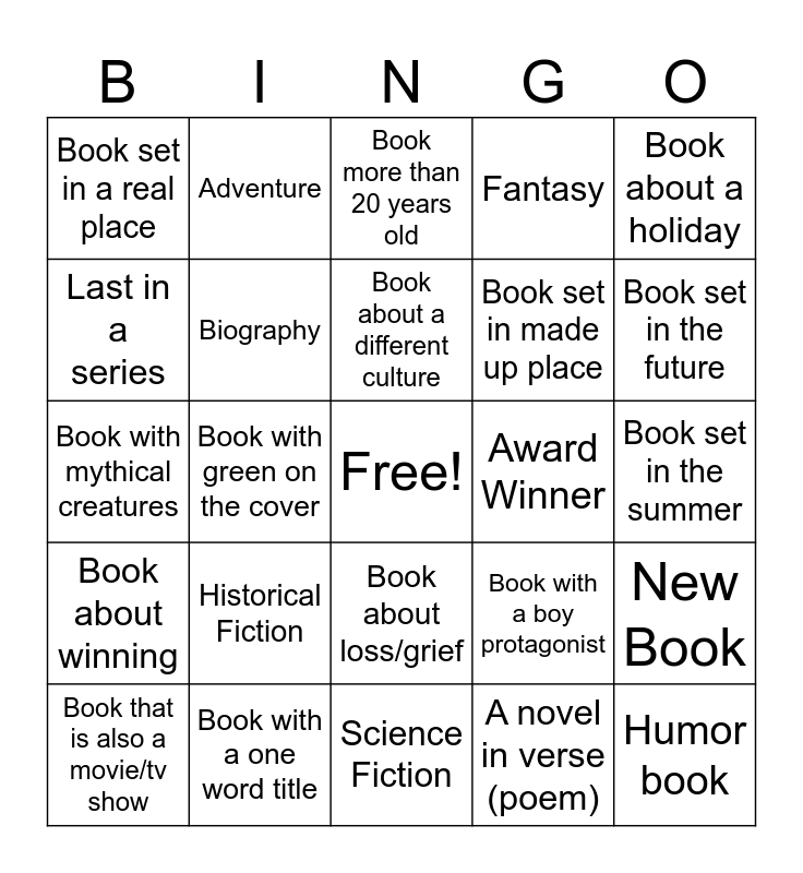 This bingo card has a free space and 49 words: Scary book, Humor book, Mystery, Science Fiction, Historical Fiction, Graphic Novel, Adventure, First in a series, Last in a series, Nonfiction, Biography, Fantasy, New Book, Book with a boy protagonist, Book with a girl protagonist, Animal Fiction, Book about a different culture, Award Winner, Book with magic in it, Book about a holiday, Book with green on the cover, A novel in verse (poem), Book set in a real place, Book set in made up place, Book about best friends, Book set in the future, Book that is also a movie/tv show, Book where author's last name begins with same letter as yours, Book about loss/grief, Book about winning, Book over 200 pages long, Book set in Louisiana, Book set on an island, Book set in the fall, Book with a one word title, Book with an animal in the title, Book with stars on the cover, Book from the public library, Book set in the summer, Book set in winter, Book set in spring, Main character same age as you, Main character older than you, Book with spies, Book with mythical creatures, Book more than 20 years old, Book with flower on the cover/ in the title, Read a book about cooking (fiction/nonfiction) and Book you chose based on the cover.
