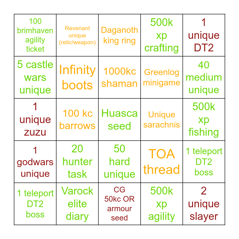 This bingo card has 25 words: 1 godwars unique, Varock elite diary, Huasca seed, 500k xp agility, 1 unique DT2, 100 brimhaven agility ticket, Revenant unique (relic/weapon), Daganoth king ring, Unique sarachnis, 1 teleport DT2 boss, 5 castle wars unique, Infinity boots, CG 50kc OR armour seed, TOA thread, 40 medium unique, 1 teleport DT2 boss, 100 kc barrows, 1000kc shaman, Greenlog minigame, 500k xp fishing, 1 unique zuzu, 20 hunter task, 50 hard unique, 500k xp crafting and 2 unique slayer.