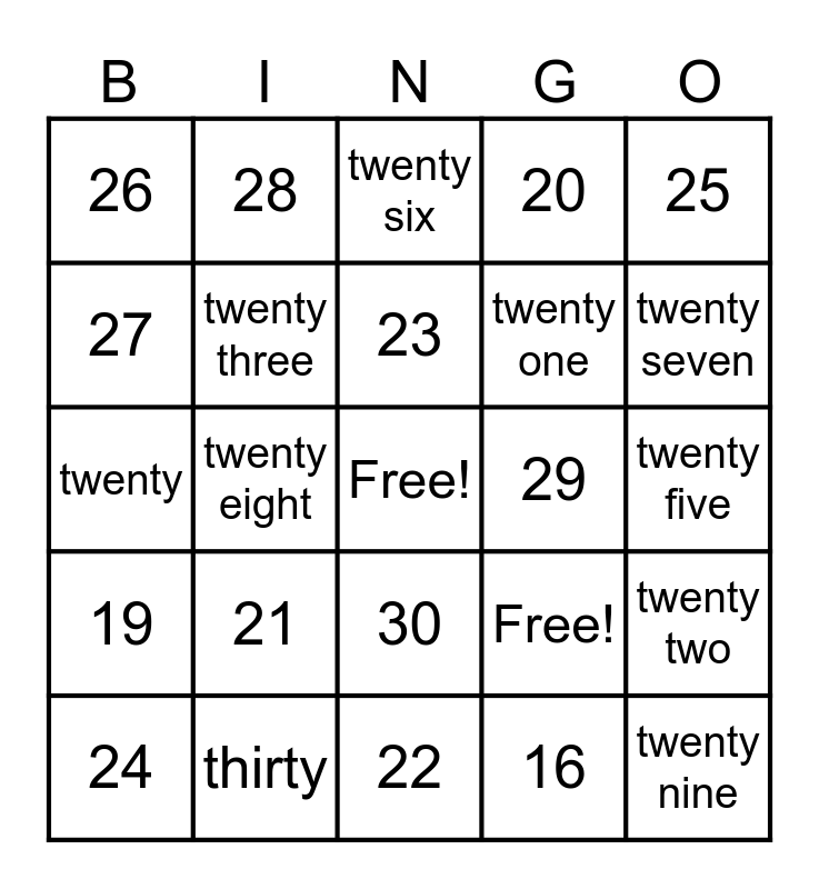This bingo card has a free space and 25 words: 21, 22, 23, 24, 25, 26, 27, 28, 29, 30, twenty one, twenty, Free!, twenty two, twenty three, twenty four, twenty five, twenty six, twenty seven, twenty eight, twenty nine, thirty, 19, 20 and 16.